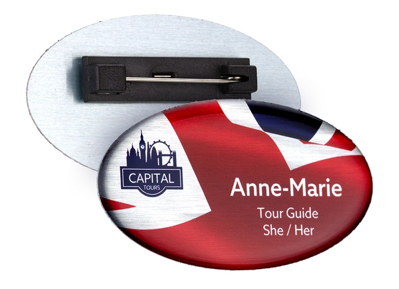 inclusivity with pronouns, language flags, or ID photographs - all beautifully protected under a clear resin dome for long-lasting clarity and durability.