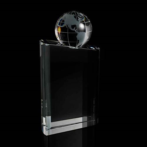 Crystal globe mounted onto a medium crystal chunky block with bevelled edges 180mm high supplied in a satin lined box. Large also available POA.