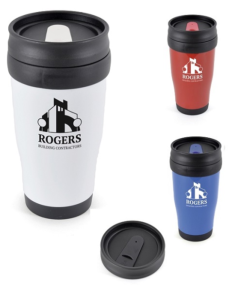 400ml double walled, AS plastic solid coloured tumbler with black PP plastic inner and secure screw top lid with coloured sliding sipper. BPA & PVC free