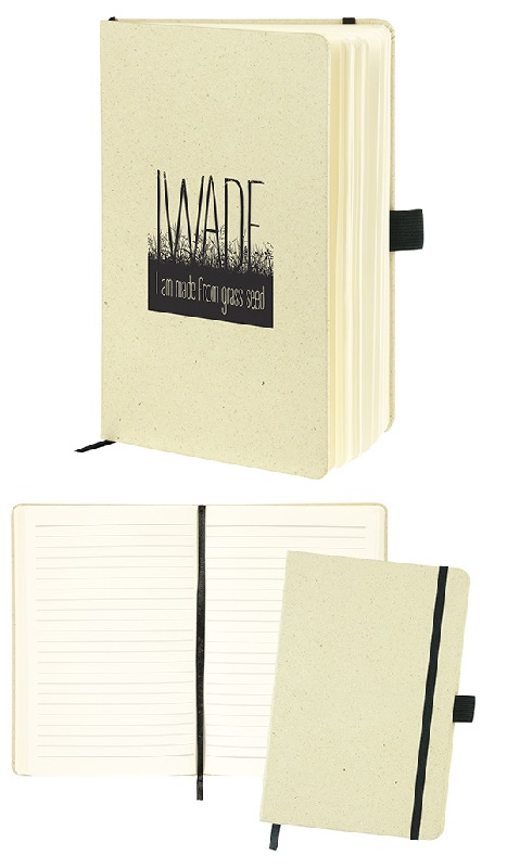 Eco A5 notebook made from grass fibre (up to 40% content) onto a recycled card board. Recycled rPET covered elastic pen loop and closure and 96 lined recycled paper pages. This pages are sustainable organic eco-friendly paper with following environmental characteristics: acid and chlorine free, free of heavy metals, recyclable, vegan and compostable.