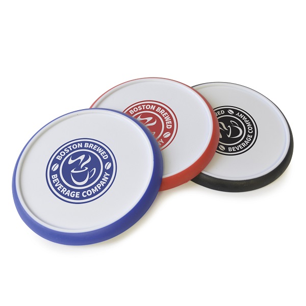 Circular white plastic coaster with coloured silicone edge for a better grip. A great all round promotional giveaway and a fantastic personalisation area to promote your message.