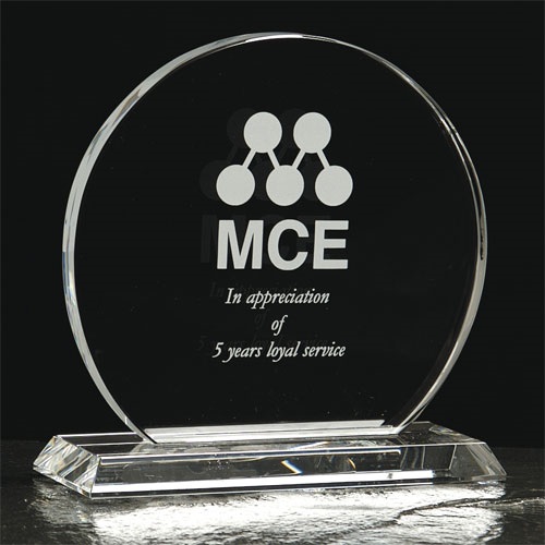 Medium optical crystal trophy circle supplied in a Satin lined box.