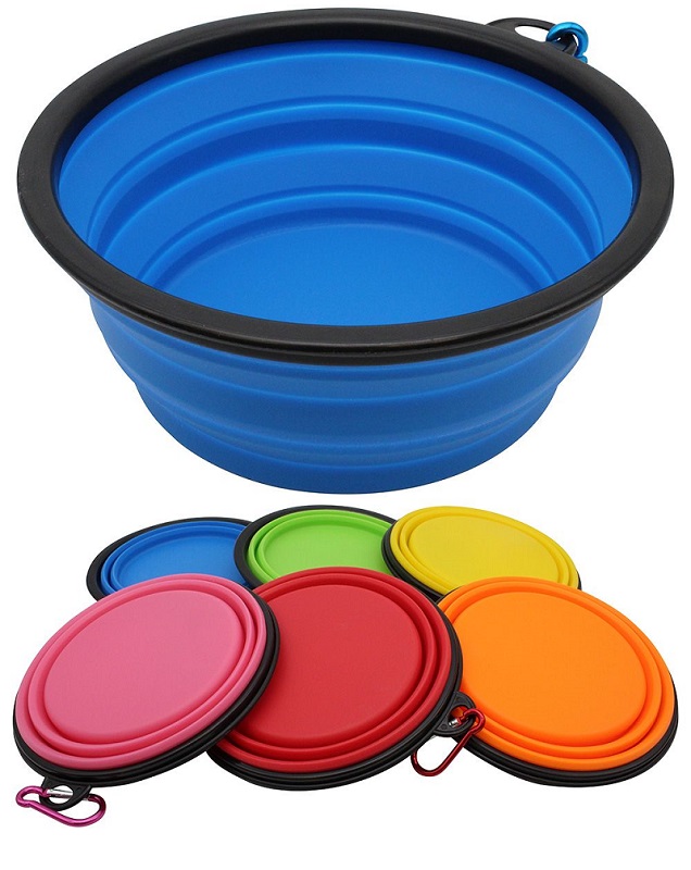 A super practical silicone pop-up dog bowl with a screen print on the bottom (outside). This compact product is simple to transport and allows owners to give their pets a drink no matter where they are.