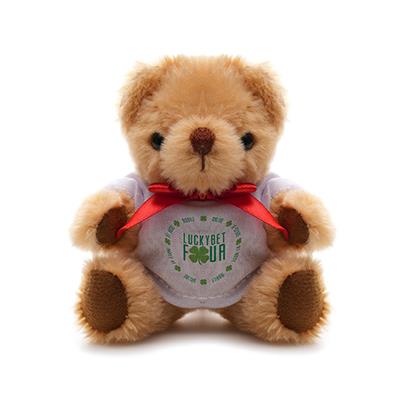 Crafted with polyester fabric and red ribbon neck tie, this 13cm teddy bear comes with imoving arms and lets, cotton filler, embroidered thread nose and mouth, plastic eyes adding a real element and white t-shirt for branding.